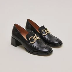 Optez pour nos nouveaux mocassins à talons VINCENNES ! On retrouve un bout carré, un petit talon, une boucle dorée et un cuir noir brillant très agréable pour tout le long de la journée. À porter pour le travail, pour un look plus décontracté, avec une robe ou encore un jean brut.