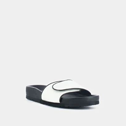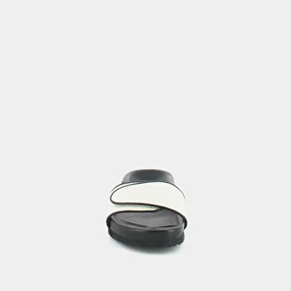 Craquez pour les mules WELDONE, la mule emblématique a été retravaillé et modernisé avec un cuir noir et blanc, et une semelle plateforme épaisse.