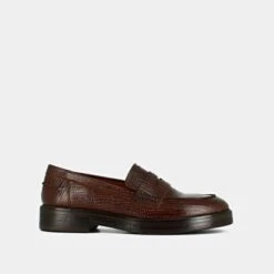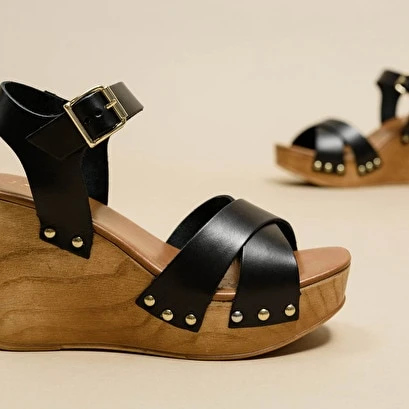 Le talon compensé s’associe joliment au cuir cognac et noir du modèle.